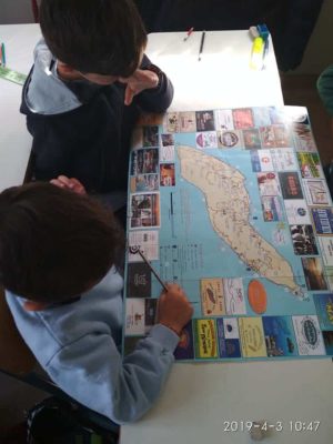 Οι μαθητές του Β2 αναζήτησαν πληροφορίες που θα μπορούσαν να περιλαμβάνονται σε έναν τουριστικό οδηγό για το κέντρο της Αθήνας και για ένα τμήμα της Ανατολικής Αττικής που περιλαμβάνει το Σχολείο μας. Στη συνέχεια, κατέγραψαν ερωτήσεις από τις πληροφορίες που συγκέντρωσαν και έτσι, δημιούργησαν τα δικά τους επιτραπέζια παιχνίδια! Η επιφάνεια πάνω στην οποία έπαιξαν οι μαθητές το παιχνίδι τους ήταν τουριστικοί χάρτες των αντίστοιχων περιοχών και οι πόντοι δίνονταν στο υπόμνημα! Ο ενθουσιασμός τους ήταν μεγάλος καθώς «περπάτησαν» από το Μουσείο της Ακρόπολης μέχρι το Καλλιμάρμαρο αλλά και από το σπίτι τους στους κοντινούς αρχαιολογικούς χώρους, τις παραλίες αλλά και την Εκπαιδευτική Αναγέννηση!