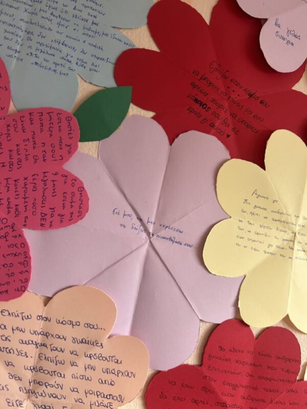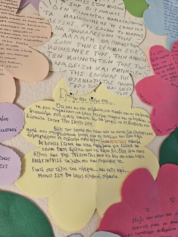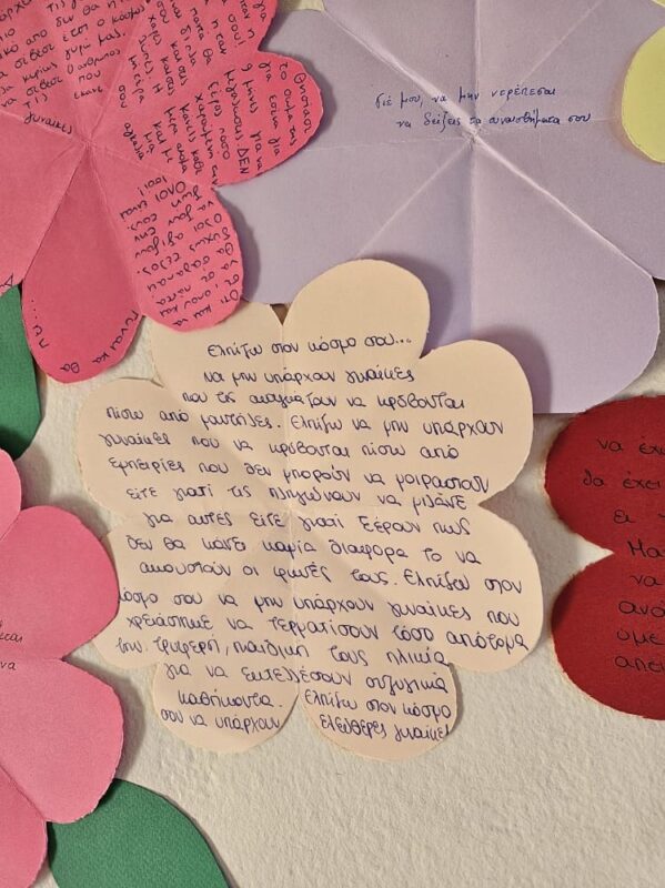 Οι μαθητές κλήθηκαν να εκφράσουν τις σκέψεις, τις ελπίδες και τα μηνύματά τους μέσα από μικρά γράμματα προς τη γυναίκα του μέλλοντος. Τα κείμενά τους μετατράπηκαν σε πολύχρωμα «λουλούδια», τα οποία ενώθηκαν σε έναν συμβολικό κήπο γεμάτο ιδέες για ισότητα, σεβασμό και ένα πιο δίκαιο μέλλον.