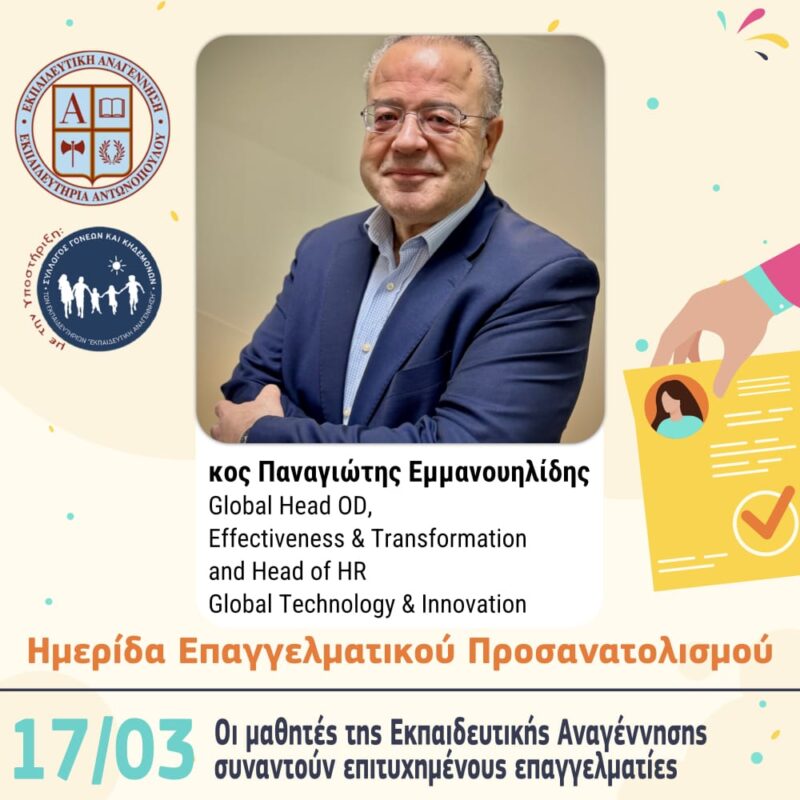 Η επαγγελματική του εμπειρία βρίσκεται στη διασταύρωση ανθρώπων, στρατηγικής, δεδομένων και ηγεσίας. Στο πλαίσιο της Ημερίδας Επαγγελματικού Προσανατολισμού θα μοιραστεί μια ρεαλιστική εικόνα για τον τρόπο λειτουργίας των παγκόσμιων οργανισμών, τις δεξιότητες που θεωρούνται απαραίτητες για το μέλλον της εργασίας και τους τρόπους με τους οποίους διαμορφώνονται επαγγελματικές πορείες σε θέσεις υψηλής ευθύνης σε διεθνές περιβάλλον.