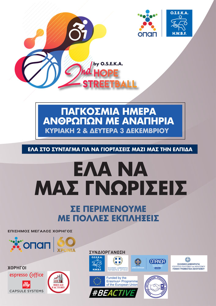 Με υπερηφάνεια το Σχολείο μας συμμετέχει στο «2ουHope Streetball» που πρόκειται να διοργανώσει για δεύτερη συνεχόμενη χρονιά η Ομοσπονδία Σωματείων Ελλήνων Καλαθοσφαιριστών με Αμαξίδιο στο πλαίσιο της Παγκόσμιας Ημέρας Ατόμων με Αναπηρίες, που τιμάται στις 3 Δεκεμβρίου.