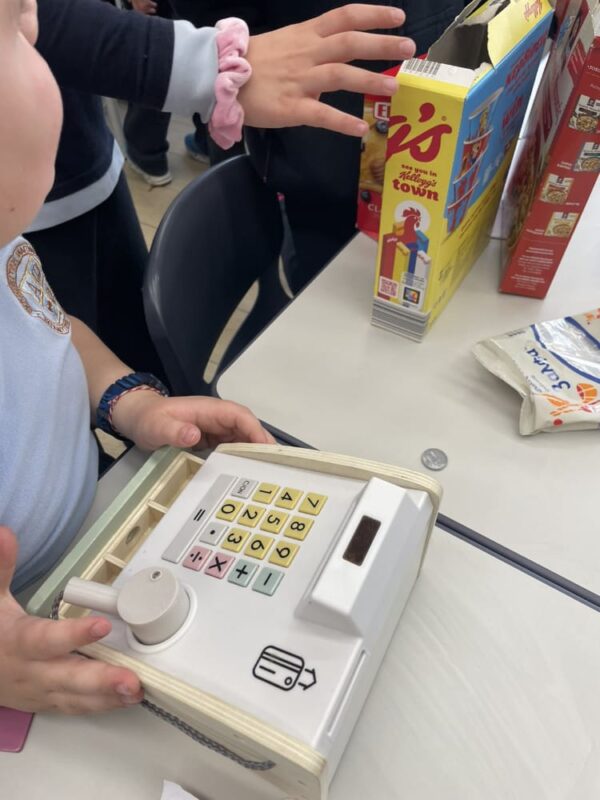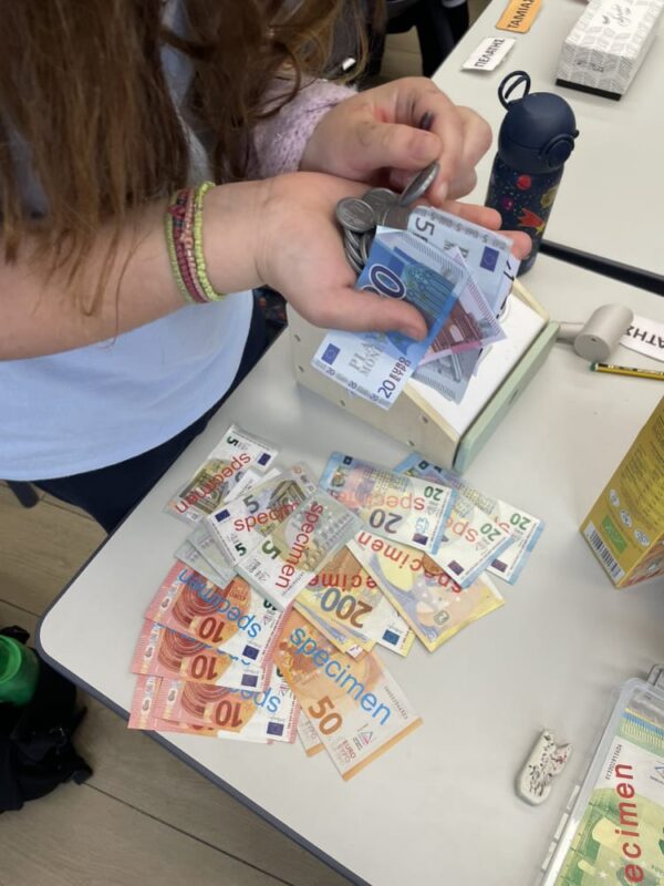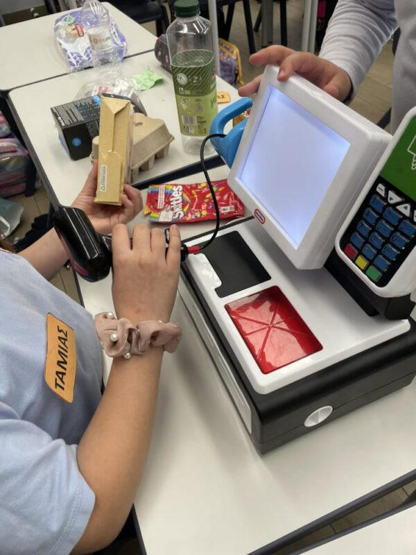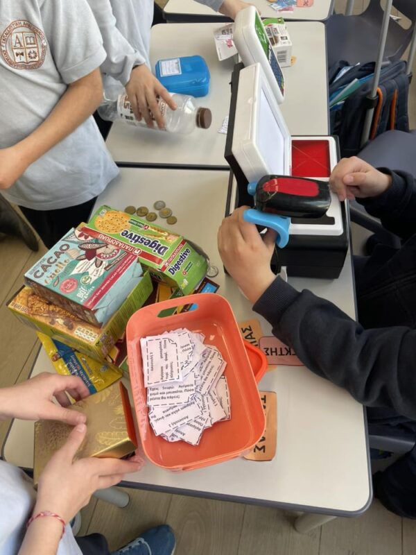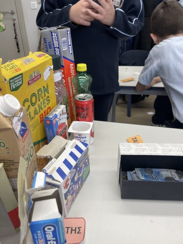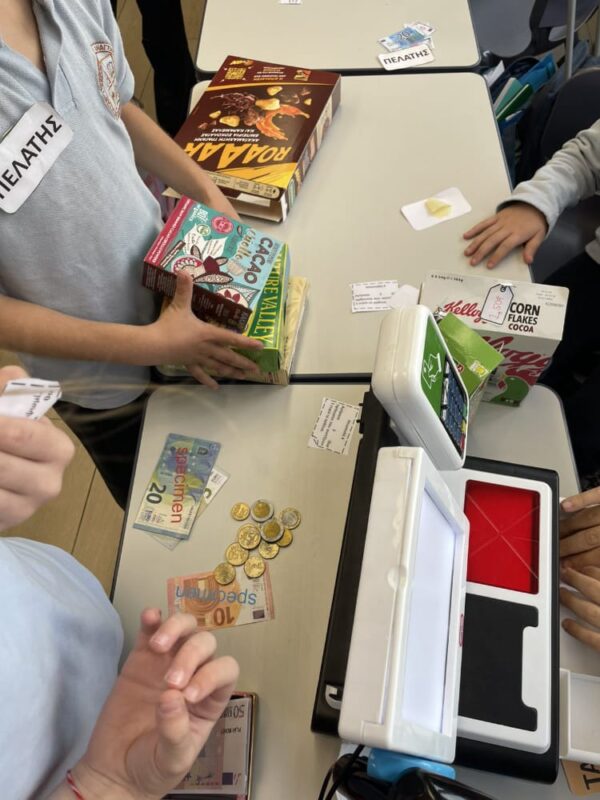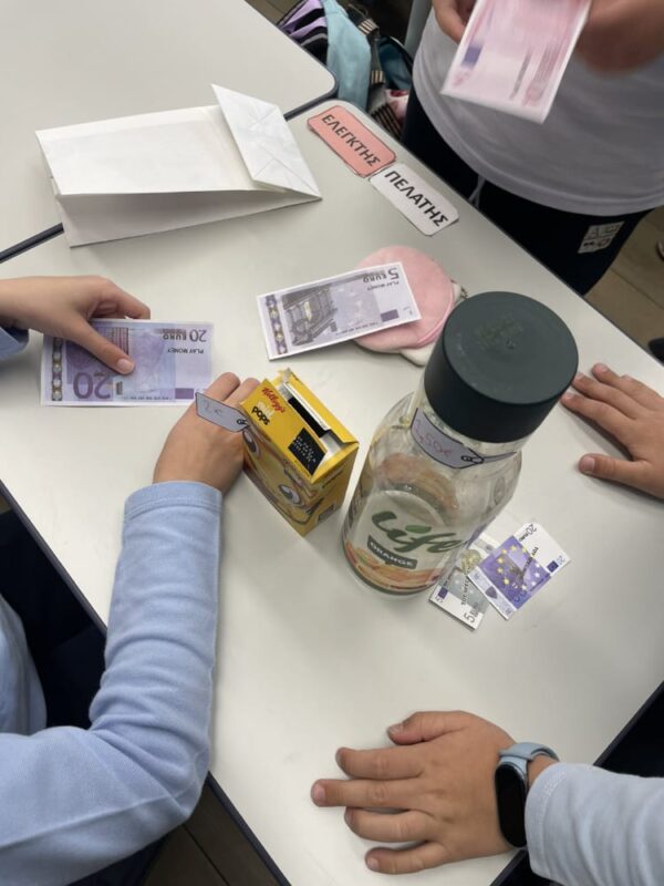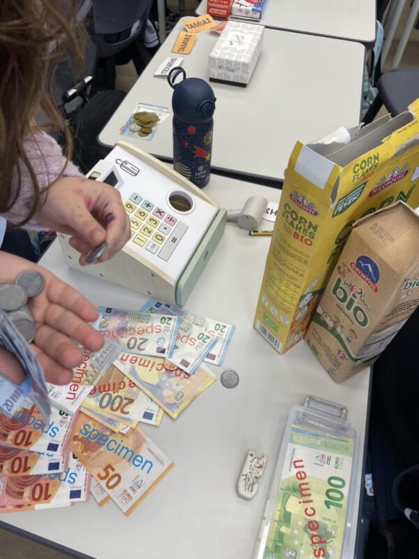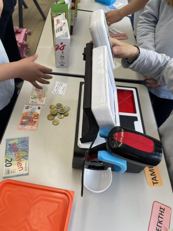 Στο παιχνίδι ρόλων που ακολούθησε, κάποιοι μαθητές ανέλαβαν τον ρόλο των ταμιών, υπολογίζοντας τις αγορές και δίνοντας ρέστα στους «πελάτες», ενώ άλλοι υποδύθηκαν τους υπαλλήλους του καταστήματος. Με τη χρήση ψεύτικων κερμάτων και χαρτονομισμάτων, οι μαθητές εξασκήθηκαν στις πράξεις με τα ευρώ και κατανόησαν καλύτερα πώς πραγματοποιούνται οι καθημερινές συναλλαγές.