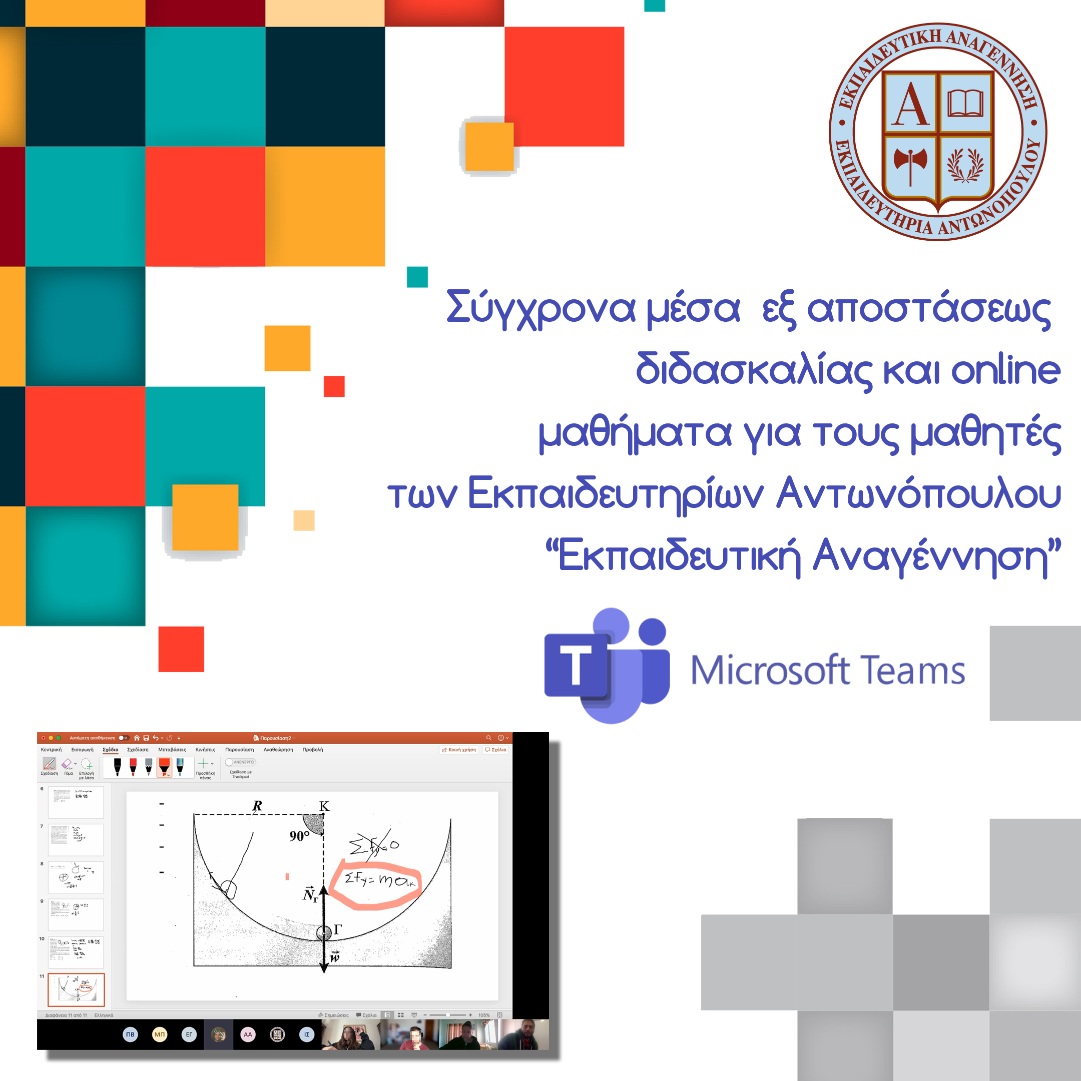 Οι μαθητές της Β’ και Γ’ Λυκείου και του Προγράμματος GCE A’ Levels πραγματοποιούν καθημερινά on line μαθήματα με τους Καθηγητές τους, χρησιμοποιώντας την εφαρμογή TEAMS της Microsoft, συνεχίζοντας απρόσκοπτα την εκπαιδευτική διαδικασία και την προετοιμασία τους για τις εξετάσεις εισαγωγής στην Τριτοβάθμια Εκπαίδευση σε Πανεπιστήμια της Ελλάδας και του εξωτερικού.